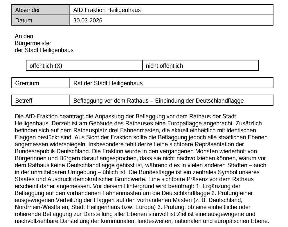 Die Szene, in der Kanzlerin Merkel schon vor Jahren bei einer Wahlparty ihrem Generalsekretär Gröhe die Deutschlandflagge weggenommen und entsorgt hat, ist legendär und wirft ein bezeichnendes Bild darauf, wie die Altparteien innerlich zu unserem Land und seinen traditionellen Werten und Symbolen stehen. Nun tritt Heiligenhaus in dieselben Fußstapfen. Schwarz-Rot-Gold ist vor dem Rathaus unerwünscht. Der Antrag unserer AfD-Fraktion, neben den anderen auch unsere Nationalfarben vor dem Rathaus aufzuziehen, wurde brüsk von der Heiligenhauser Altparteienkoalition abgelehnt. Armes Deutschland! Hier unser Antrag: